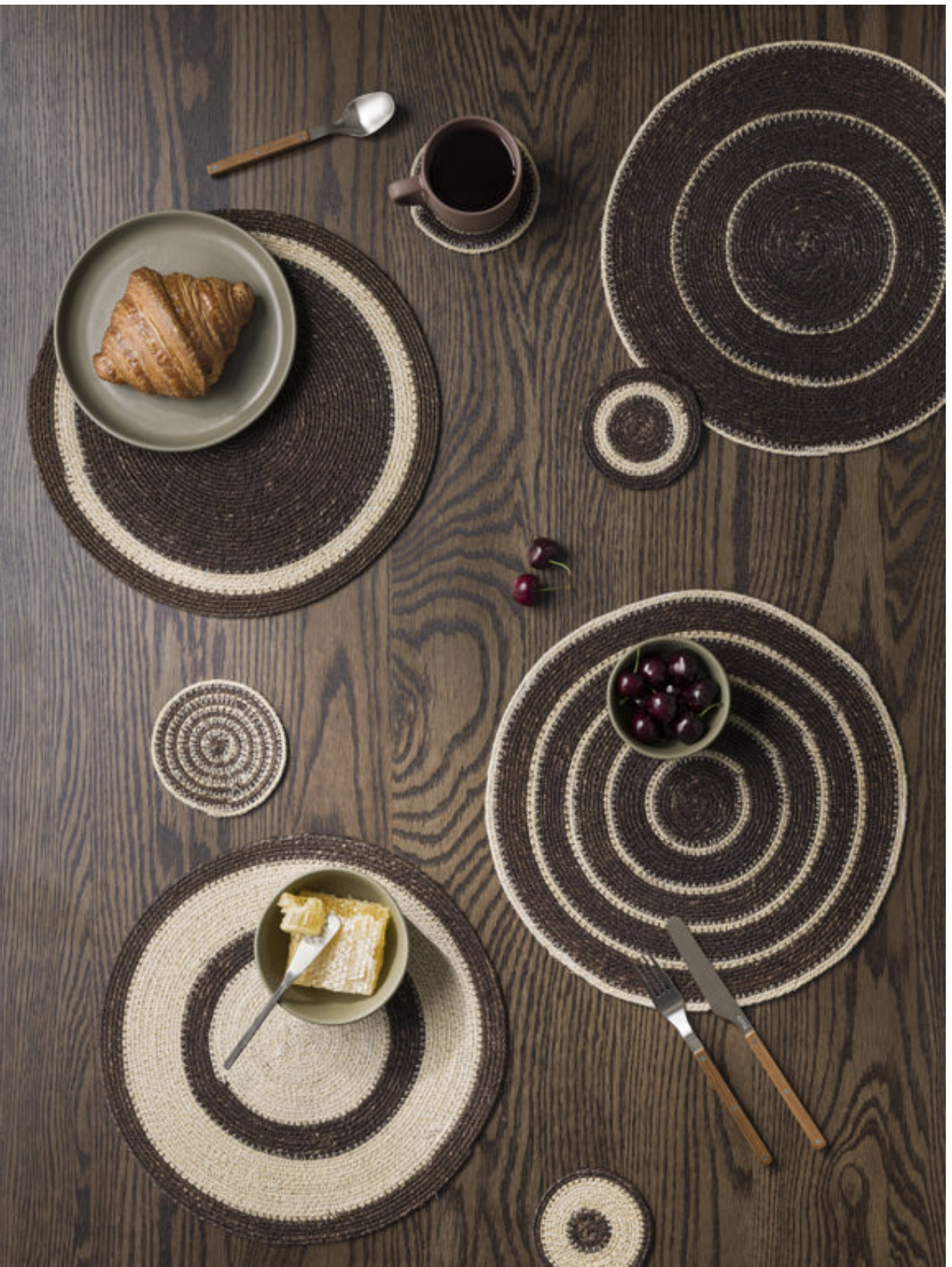 Bring natural charm to your table with the Agora woven placemats. The four-piece set showcases unique two-tone circular designs, each with playful variations in width and spacing.