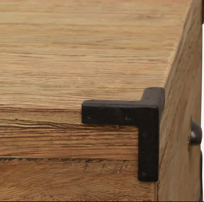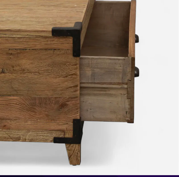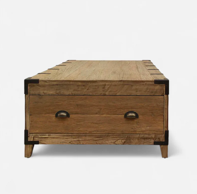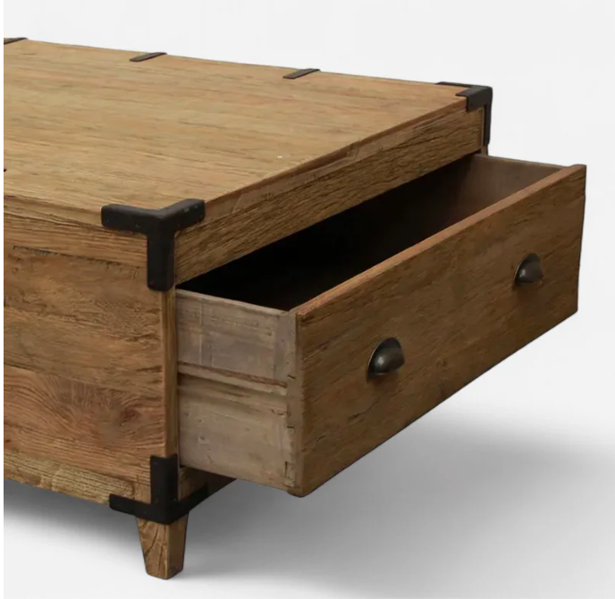 - Style Description: Chunky trunk style coffee table made from reclaimed oak with metal hardware and detailing. Features a drawer at each end for added storage.