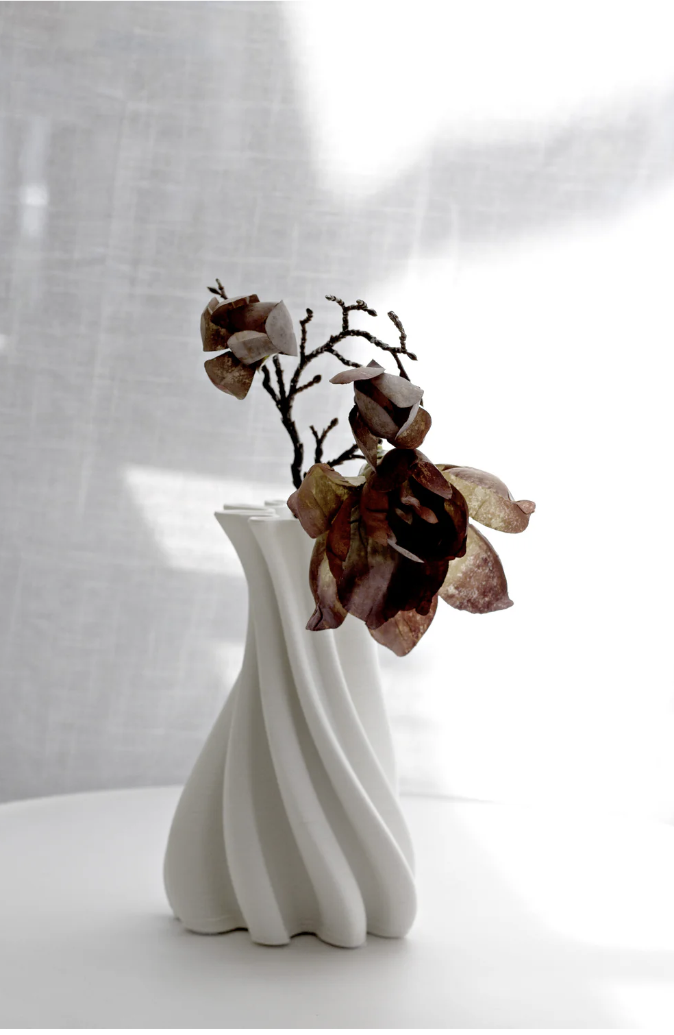 Crafted from waterproof 3D printed porcelain, this piece balances durability with artistic edge. Style it with fresh blooms or oversized branches for height and movement, or leave it empty and let the sculptural form do the talking. Available in two sizes, Camila works just as well as a standalone statement as it does layered in a sculptural pair.