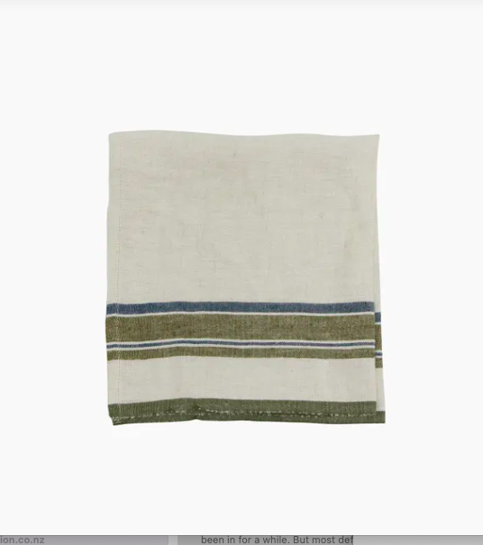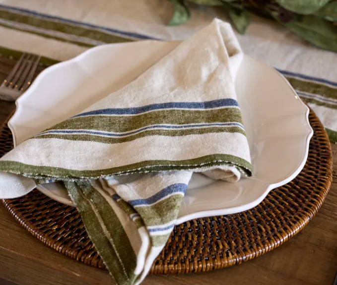 - Style Description: The Green Selvedge Stripe Linen Napkin is ideal for festive gatherings yet versatile enough for everyday use. Delicate navy stripes paired with bold green accents create a modern farmhouse charm. Pair it with the matching tablecloth, tea towel, and table runner for a cohesive look.