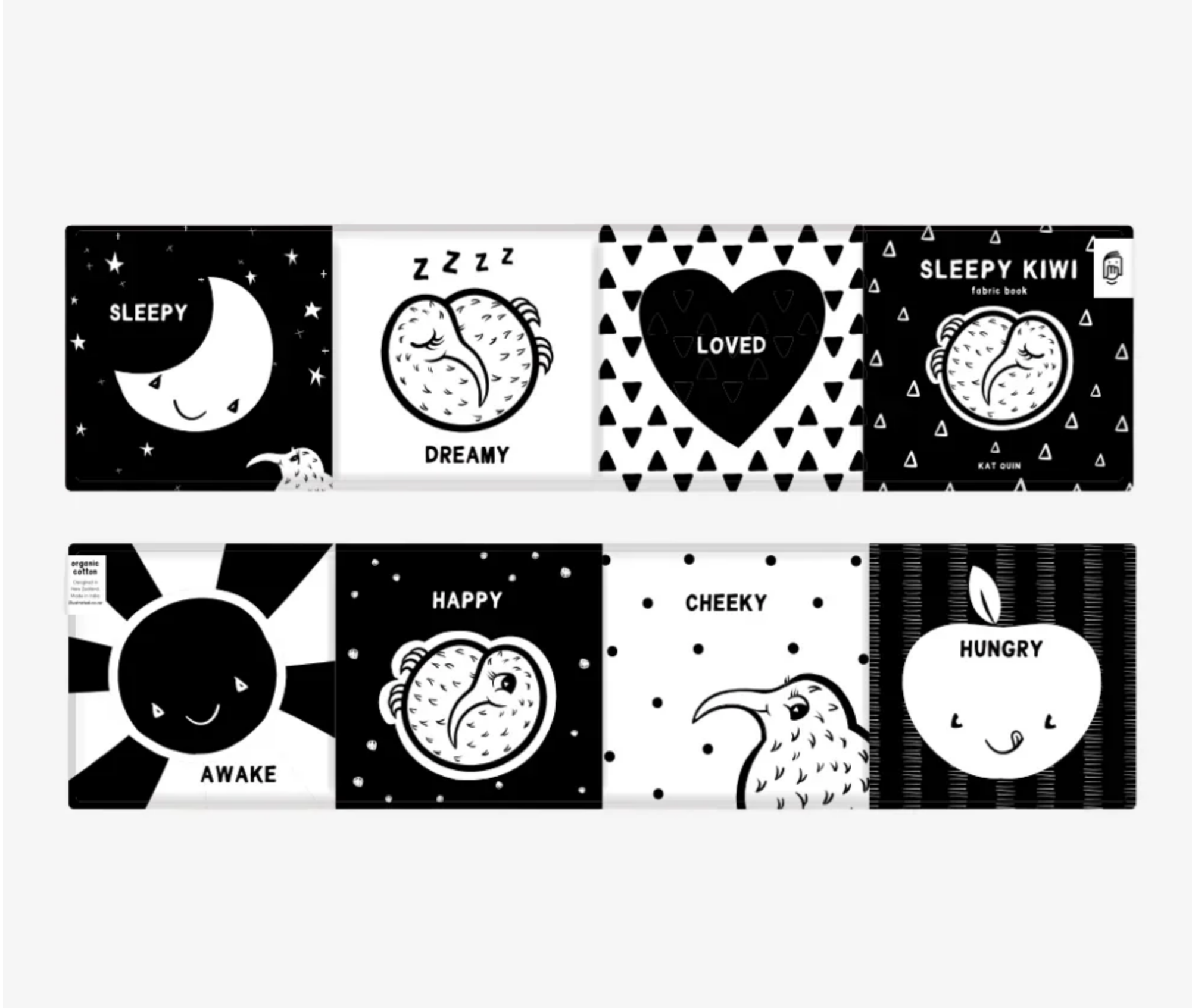 From Kat Quin, the award-winning creator of the much-loved Sleepy Kiwi book. Designed in black & white for developing vision.