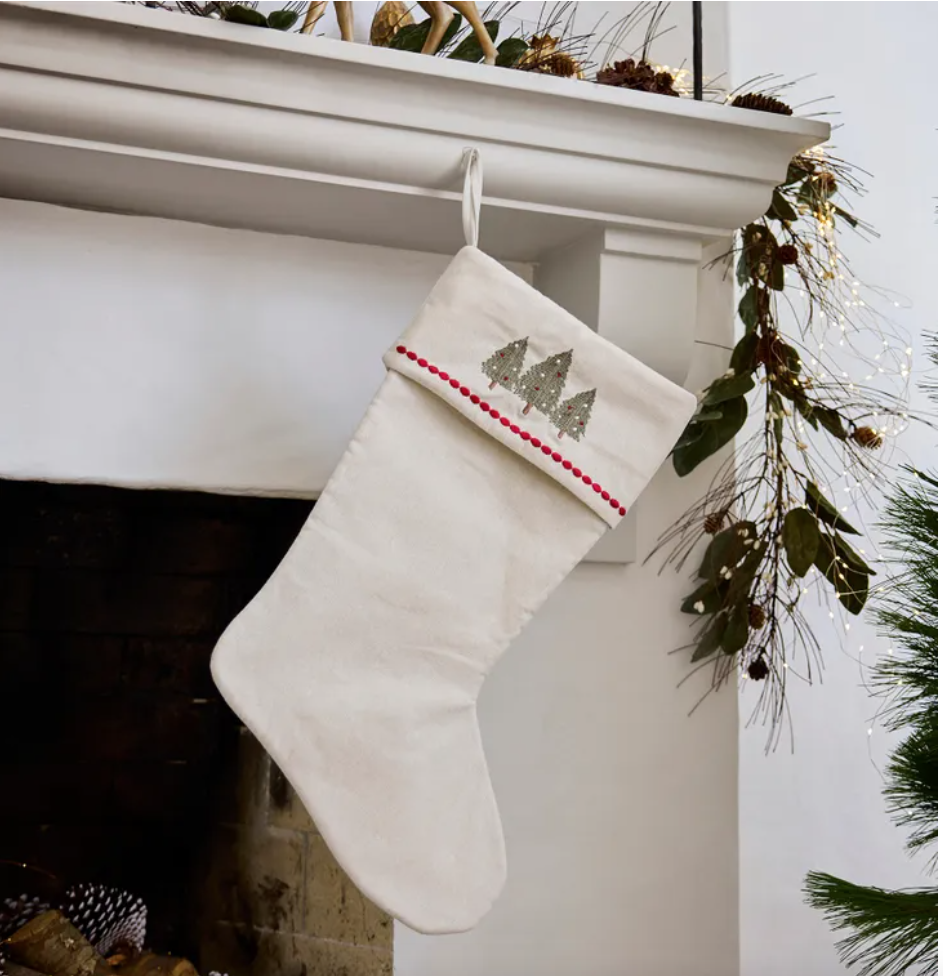 Style Description: Festive Christmas stocking with embroidered tree with lights.