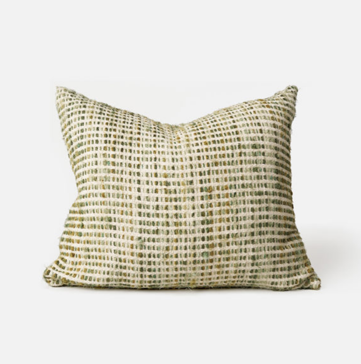The heavyweight weave intersects neutral tones with the shifting hues of a deep green gradient. Each cover is meticulously handspun, woven, and dyed, celebrating the craftsmanship and resulting in a unique, organic finish.